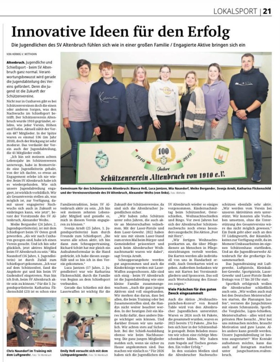 Der Schützenverein Altenbruch von 1910 e.V. hat vor 40 Jahren eine weitere Abteilung gegründet – die Junioren. Die aktiven Junioren haben zu diesem Anlass eine Feier auf die Beine gestellt. Mit den Gründungsmitgliedern, den ehemaligen Majestäten, der aktiven Königsfamilie und der Juniorenabteilung wurde ausgelassen gefeiert und über alte Zeiten gesprochen.„Herzlichen Dank an alle die uns bei der Vorbereitung und der Umsetzung der Feier geholfen haben“, so Svenja Arndt. Das Buffet mit vielen leckeren Salaten und Bratwurst war ein guter Start in den Abend, danach blieb der Tresen auch nicht leer und die Stimmung war den gesamten Abend sehr gut. Um sich noch besser an die letzten 40 Jahre zu erinnern, wurde eine Diashow mit vielen Bildern gezeigt. Und damit sich auch in den nächsten Jahren noch an diesen Abend erinnert werden kann, wurde eine Fotoecke aufgebaut. Hier entstanden viele tolle Bilder, an die man sich beim nächsten Jubiläum wieder erinnern kann.