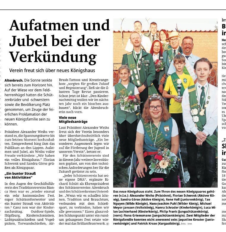 Der Schützenverein Altenbruch hat in diesem Jahr einiges zu feiern gehabt. Es stand ein weiteres Jubiläum an, denn die vereinseigene Kanone wurde vor 50 Jahren Eigentum des Schützenvereins Altenbruch. Die Geschichte dahinter ist auch heute noch bei vielen Mitgliedern bekannt. Im Jahr 1973 wurden sechs Kanonenrohre im Schlosspark gefunden, da die Stadt Cuxhaven für zwei davon keine Verwendung hatte, wurden diese dem Panzerbataillon 74 in Altenwalde geschenkt. Ewald Behrens (Mitglied des SV Altenbruch) konnte für eine Kiste Bier das Rohr erwerben. Nachdem das Rohr nach Altenbruch gebracht wurde, haben sich einige Mitglieder getroffen und das Rohr auf einer Lafette befestigt und Holzräder mit Eisenbeschlägen befestigt. Im Spätsommer 1973 wurde das Rohr gereinigt und mit 1000 Gramm Schwarzpulver geladen und mit einer Zündschur versehen. Kurt Biermann, Horst Flurschütz und Hermann Abels gaben einen Schuss ab und es wackelten sogar 800 Meter weiter die Fenster. Große Erleichterung bei allen Beteiligten. Seit 1974 wurde dann in jedem Jahr zum Beginn des Schützenfestes zwei Schüsse in Richtung Rathaus Stadt Cuxhaven abgegeben.